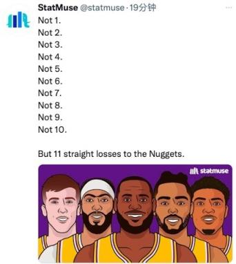美媒StatMuse发文(按詹姆斯加盟热火的夺冠豪言格式)打趣道:“Not1(不是一场)、Not2、...而是连续11场输给掘金。”