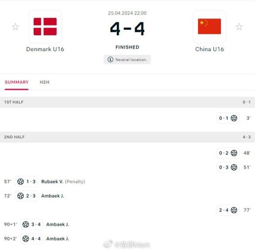 中国U16和丹麦4-4这场,大家都为了锻炼球员吧,上半场中国主力打丹麦轮换1-0,下半场丹麦继续丢球换主力上来,前锋安拜克戴帽,中国队换替补3-4。