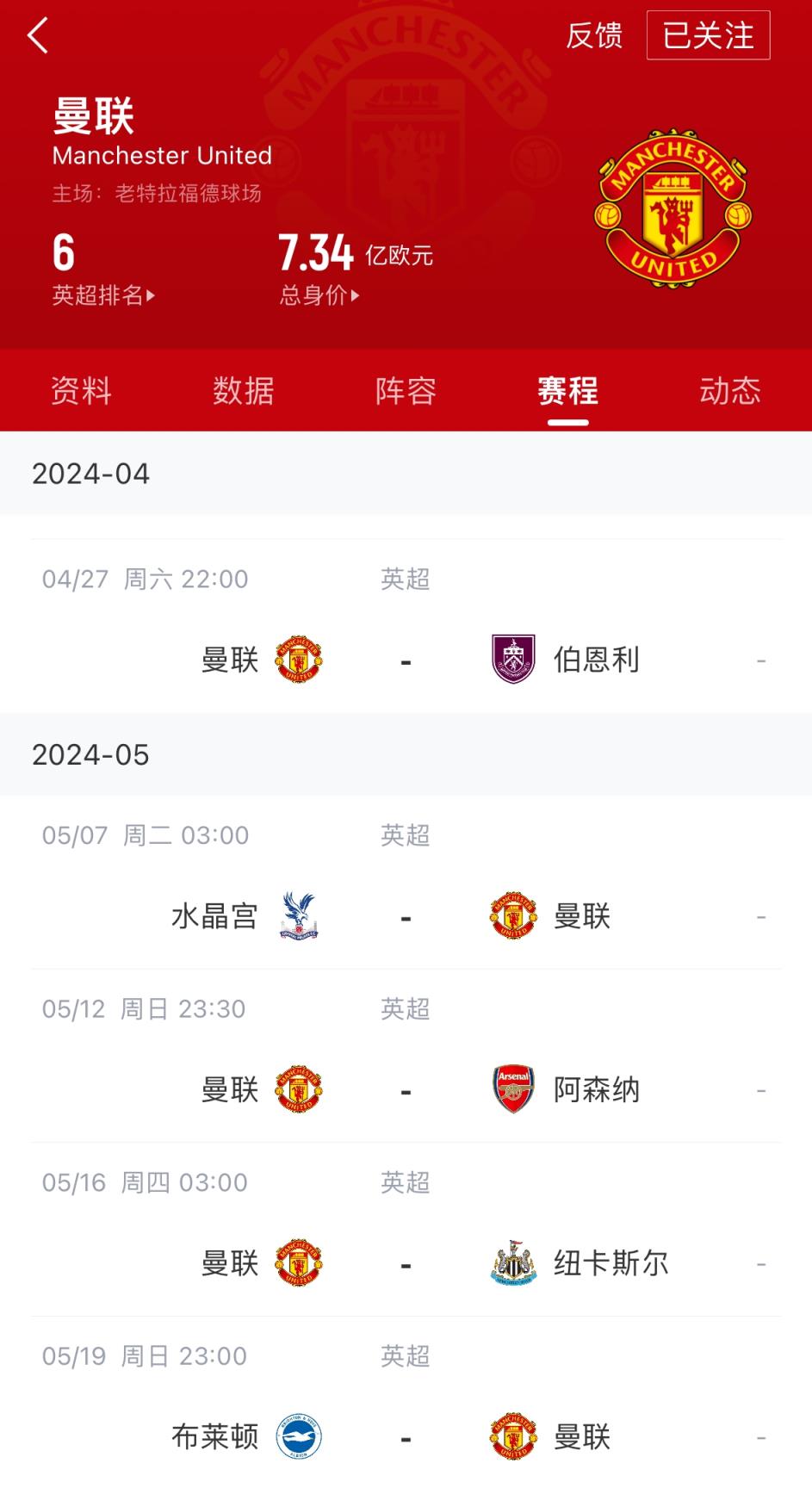 04月26日讯 4月27日英超第35轮,曼联将对阵伯恩利。