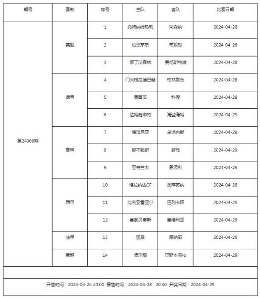 传足胜负游戏第24069期集齐了英超、德甲、西甲、意甲、法甲和葡超六大顶级联赛。其中英超和西甲本周末将分别上演北伦敦德比和安达卢西亚德比。志在争冠的曼城客场挑战力争保级的诺丁汉需做好面对困难的准备。在德甲联赛中,位于保级区边缘的门兴和柏林联将上演一场保级恶战。